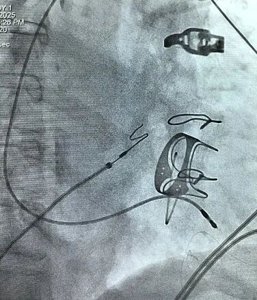考虑患者有风湿性心脏病换瓣术、心功能不全和房颤伴慢心室率,术后起搏比例超过40%,单纯右室心尖或间隔起搏可能引起或加重心功能不全;经术前手术组讨论并经患者及家属知情同意决定于2025-09-15行左束支起搏植入术。手术成功行左侧腋静脉穿刺成功后,标准方法置入预制间隔弯鞘(K鞘)和电极;因为右房巨大支撑鞘无法到位,电极无法得到鞘的支撑,电极无法旋入左束支区域,术中操作近一小时,常规标准方法行左束支区域电极植入失败(图1),如果行右侧间隔植入,这样患者无法从这一先进起搏技术中获益;单其俊教授建议根据这个患者心脏特殊情况,用加硬(红色)导丝手塑3D间隔异型弯(根据患者心脏大小个体化量身定制)直接用ABBOTT普通心室螺旋电极进行左束支植入,通过20分钟艰难努力手术终于成功(图2),所有起搏参数满意(图3-5)。