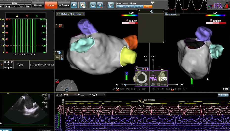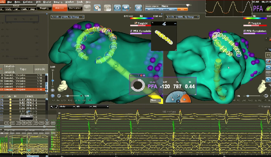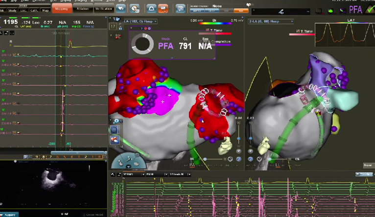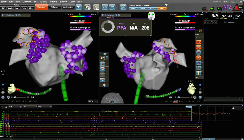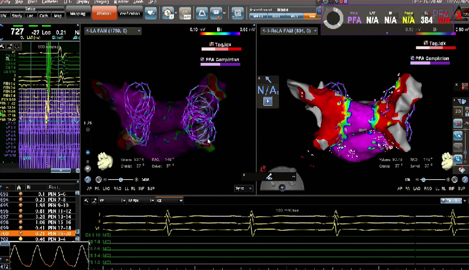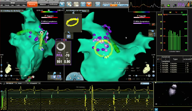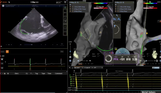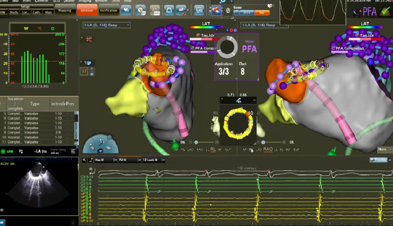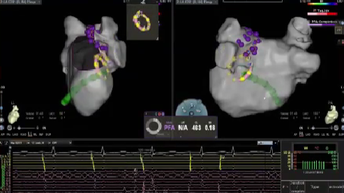 在PFA房颤手术中,三维很重要,可以帮助判断贴靠怎么样,寻找哪里有gap,同时现在是绿色电生理时代,只有三维才能做到绿色。PFA房颤手术中穿刺需要偏前偏低,结合ICE的穿刺能够使可调弯鞘管配合PFA导管在右下肺贴靠更好。术中肝素补足很重要,ACT300以上能大大减少无症状脑损伤等并发症。