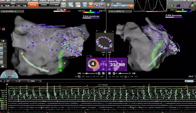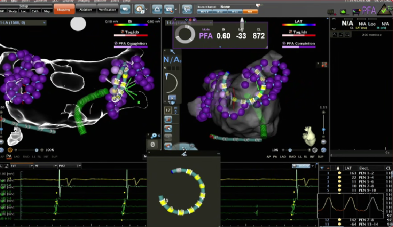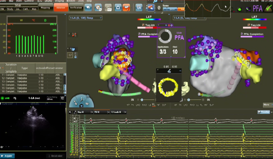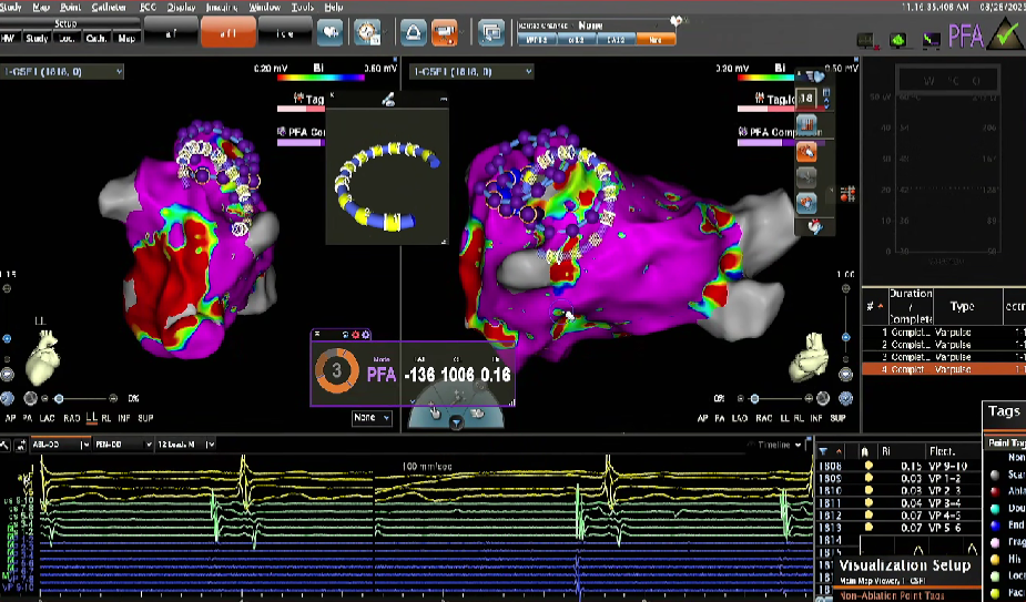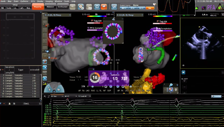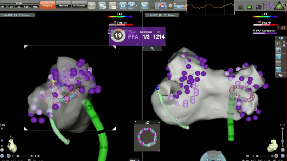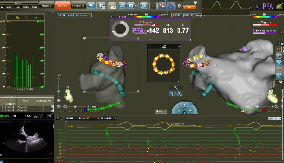在PFA房颤手术中,三维很重要,可以帮助判断贴靠怎么样,寻找哪里有gap,同时现在是绿色电生理时代,只有三维才能做到绿色。PFA房颤手术中穿刺需要偏前偏低,结合ICE的穿刺能够使可调弯鞘管配合PFA导管在右下肺贴靠更好。术中肝素补足很重要,ACT300以上能大大减少无症状脑损伤等并发症。