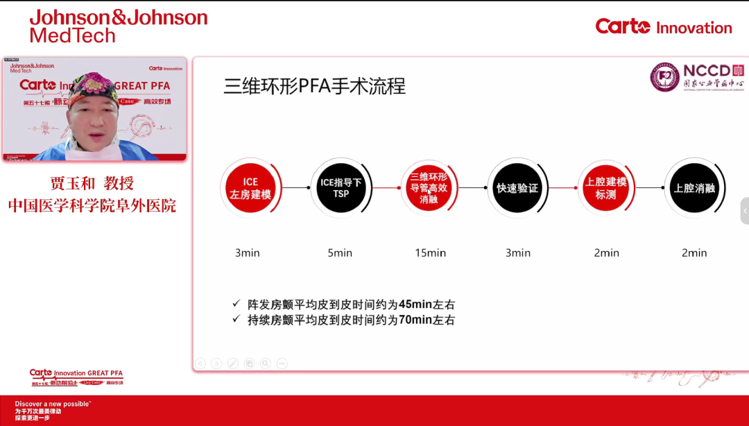 目前已经开始日间手术室,通过局麻的方式完成零射线阵发房颤。日间手术中,病人常规绑束腹带,防止肌颤。大部分患者大部分都能耐受,小部分在肺静脉内部可能会咳嗽,支气管痉挛。在交流中也提到,利用VARIPULSE建模,过程中做TPI可以提升手术效率。强生推荐的workflow不仅能提升整体操作效率,患者术后恢复效果也比较理想。