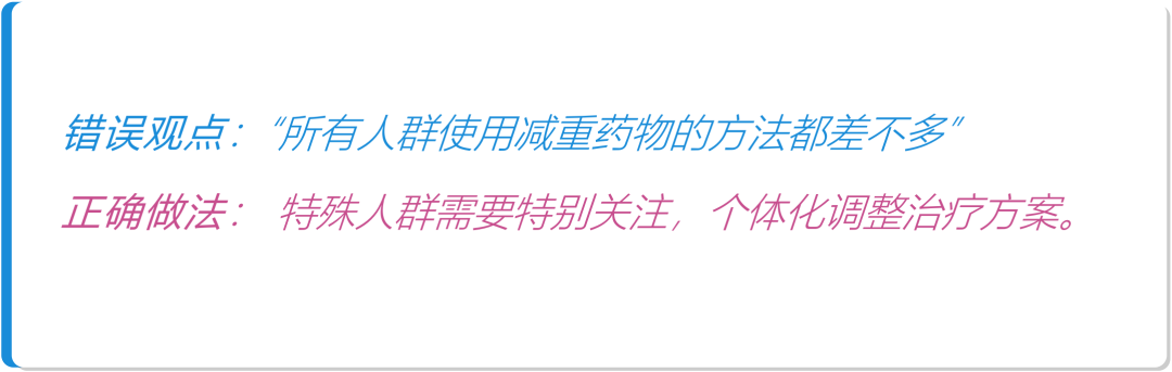 “老年肥胖人群常合并慢性病,需警惕药物相互作用。减重药物初始剂量可减半,根据肝肾功能调整”(1A)