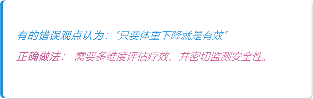 正确做法: 需要定期评估疗效和安全性,无效时应考虑换药或停药。推荐意见14指出:“使用减重药物最大可耐受剂量治疗3个月,体重未下降>5%,可考虑换用其他减重药物”。