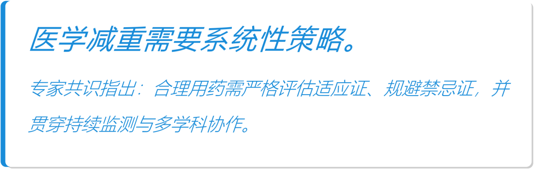 推荐意见7强调:“需要对患者进行个体化综合评估后启动减重药物治疗。对于使用减重药物风险较高或耐受性较差的患者,须在充分评估利弊后,在专业医生指导下合理使用减重药物”(证据级别1B)。