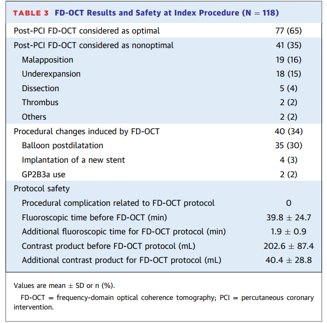 尽管血管造影理想率高达93%,FD-OCT仍发现35%(41例)患者存在异常,其中贴壁不良16%、支架扩张不全15%、夹层4%、血栓2%。40名(98%)的异常患者接受了补充治疗:35例球囊后扩张、3例追加支架植入、2例GP2b3a抑制剂使用。FD-OCT检查增加了对比剂用量平均为40.4mL(PCI术中平均总用量203mL),增加透视时间1.92分钟(PCI术中总时间40分钟),无OCT操作相关并发症。