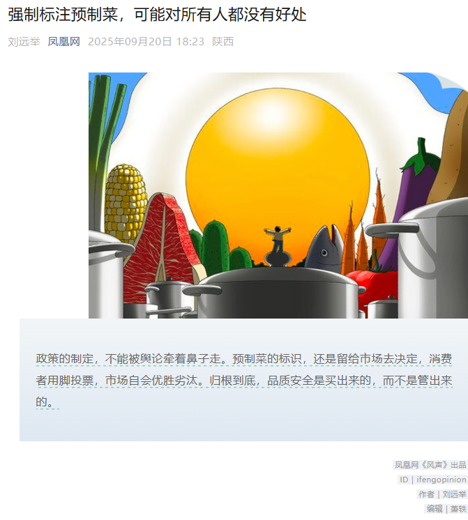 2025年9月,一场预制菜论战席卷社交媒体,热度渐消之际,凤凰网一篇《强制标注预制菜,可能对所有人都没有好处》的文章再度引发关注。文首提到“政策的制定,不能被舆论牵着鼻子走。预制菜的标识,还是留给市场去决定,消费者用脚投票,市场自会优胜劣汰。归根到底,品质安全是买出来的,而不是管出来的。”