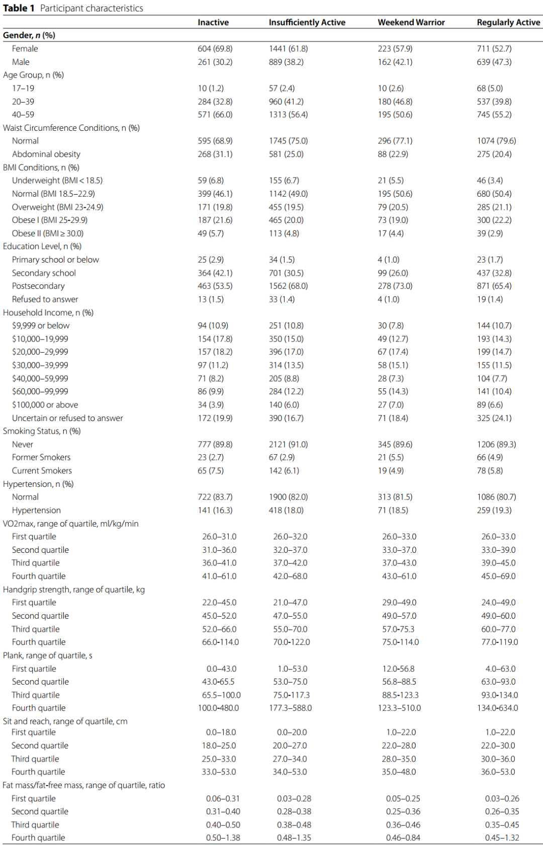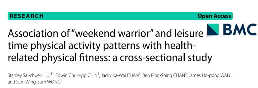 香港学者开展了一项基于全港体能调查的横断面研究,旨在解决这些研究空白,本研究的主要目的是分析”周末战士”运动模式与所有健康相关体能成分的关联。次要目的是调查运动不足的个体(即每周MVPA低于150分钟)仅进行1-2次运动,或仅完成推荐运动量一半(75分钟MVPA每周)时,是否仍能比不运动带来可比或略优的体能益处。最后,本研究还进一步探讨了高强度”周末战士”运动模式对这些体能成分的影响。这些发现可为公共健康策略提供信息。
