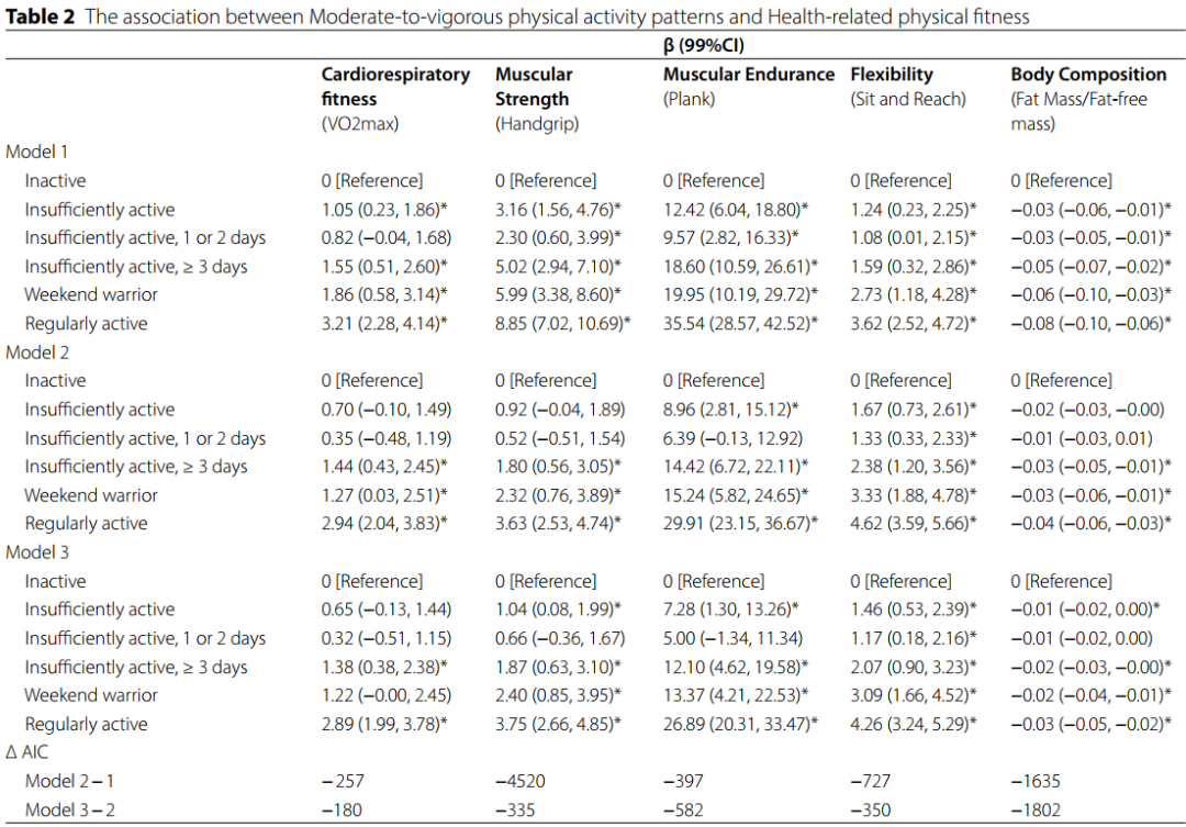 “周末战士”组在肌肉力量(β=2.40, 99%CI 0.85-3.95)、肌肉耐力(β=13.37, 99%CI 4.21-22.53)、柔韧性(β=3.09, 99%CI 1.66-4.52)和身体成分(β=-0.02, 99%CI -0.04至-0.01)上显著优于不运动组,但心肺耐力未达到显著性差异(β=1.22, 99%CI -0.00-2.45, p=0.01)。