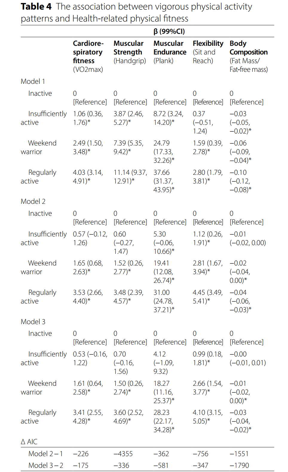 在完全调整模型中,高强度”周末战士”组和规律运动组在所有体能成分上均显著优于不运动组(”周末战士”组:VO2max β=1.61, 99%CI 0.64-2.58;握力 β=1.50, 99%CI 0.26-2.74;平板支撑 β=18.27, 99%CI 11.16-25.37;坐位体前屈 β=2.66, 99%CI 1.54-3.77;身体成分 β=-0.01, 99%CI -0.02-0.00)。这表明高强度运动可能更有效地改善心肺耐力。