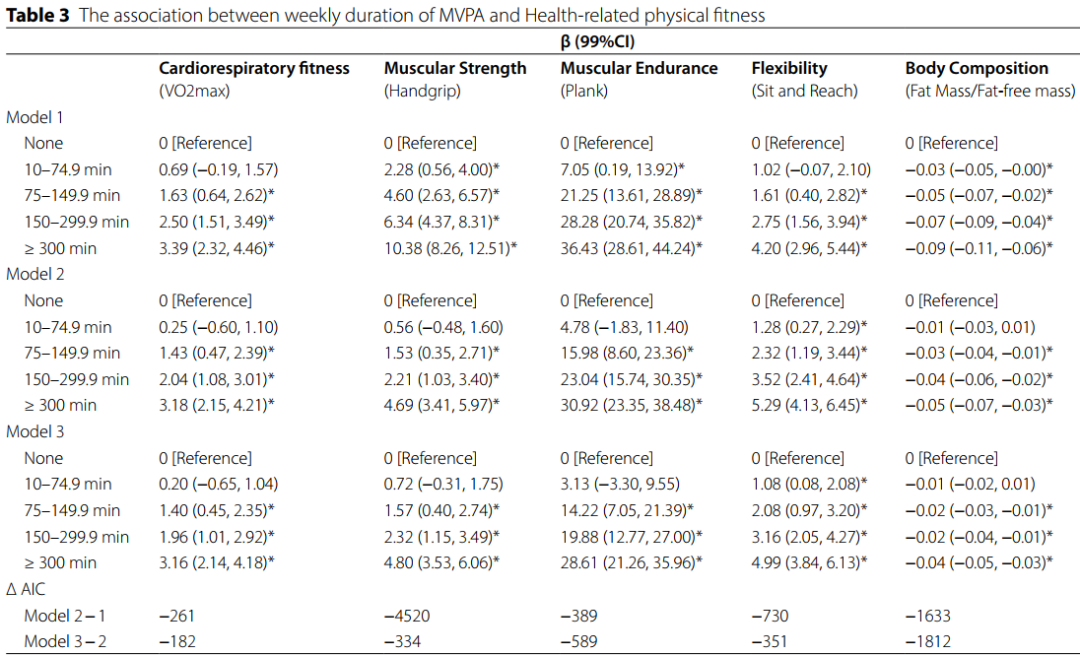 即使仅进行推荐量一半的MVPA(75-149.9分钟/周),也在所有体能成分上显著优于不运动组(VO2max β=1.40, 99%CI 0.45-2.35;握力 β=1.57, 99%CI 0.40-2.74;平板支撑 β=14.22, 99%CI 7.05-21.39;坐位体前屈 β=2.08, 99%CI 0.97-3.20;身体成分 β=-0.02, 99%CI -0.03至-0.01)。