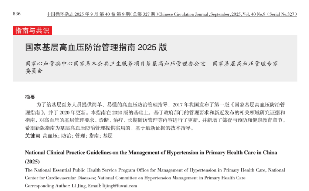 2025年9月26日,在中国心脏大会期间,国家心血管病中心国家基本公共卫生服务项目基层高血压管理办公室发布《国家基层高血压防治管理指南2025版》。《国家基层高血压防治管理指南》(以下简称《指南》)是基层医疗卫生机构开展高血压患者健康管理服务的技术指导文件,于2017年首次发布,这次是第二次更新,国家基层高血压管理专家委员会共130位专家参与了更新工作。