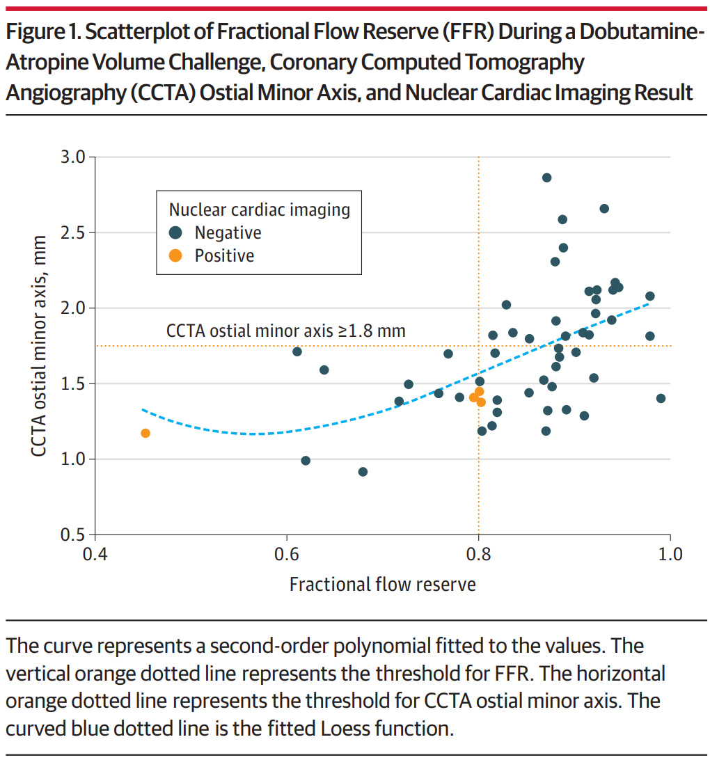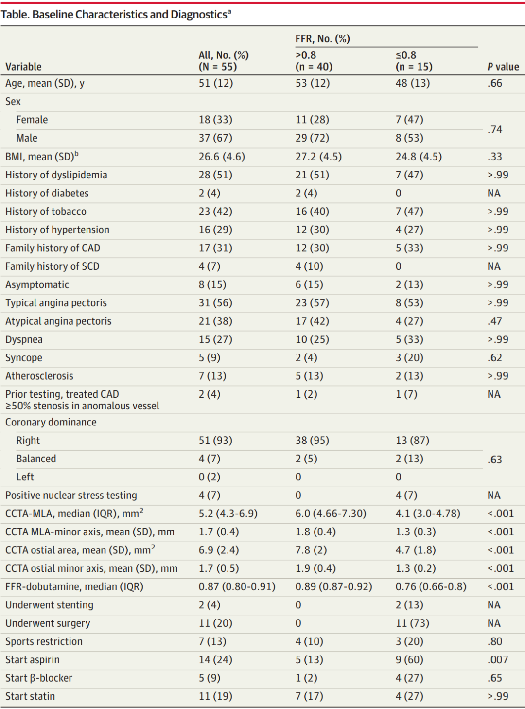从109例新诊断R-AAOCA患者中,最终纳入55例进行分析。所有患者均接受多模态心脏成像:首先进行CCTA解剖评估,随后进行功能性核素显像(运动负荷SPECT或多巴酚丁胺负荷PET),最后以有创多巴酚丁胺FFR测试作为参考标准。血流动力学相关性定义为多巴酚丁胺FFR值≤0.8。