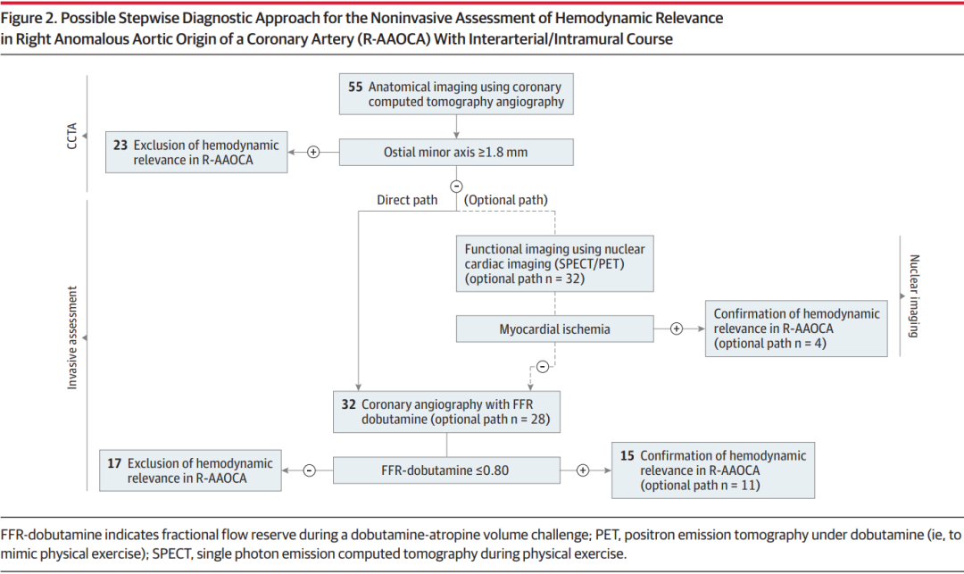 通过结合解剖学和功能性无创成像的多模态心脏成像方法,共49%的患者(27例)被正确评估(图1):CCTA排除了42%血流动力学不相关的R-AAOCA患者(23例,占非血流动力学相关病例的58%),核素显像正确识别了7%的患者(4例)为血流动力学相关的R-AAOCA患者。其余病例(28例,51%)需进一步有创评估。
