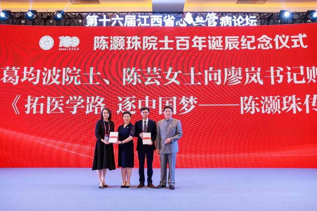 上海复旦大学教育发展基金会陈灏珠院士医学发展专项基金主任陈芸女士,南昌大学第一附属医院吴印生教授及葛均波教授与在场嘉宾共同追忆陈灏珠院士的学术成就与人格风范。在庄重而温情的气氛下,葛均波教授与陈芸女士共同向廖岚教授、朱建兵教授赠送《拓医学路 逐中国梦——陈灏珠传》一书,以书为纽带,共同完成一场薪火的传承。