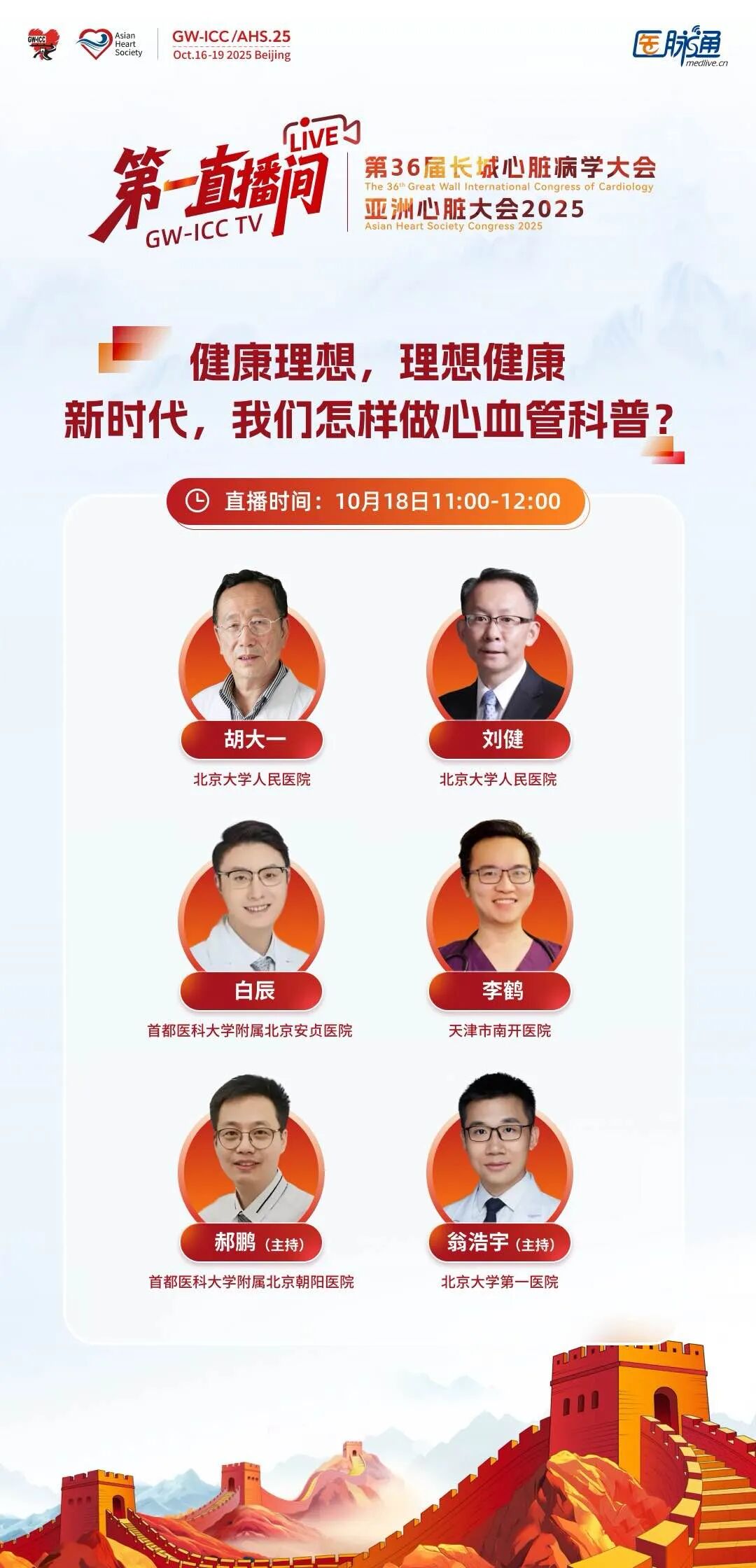 作为心血管医生,您是否常因患者对疾病认知不足而惋惜?是否困惑于如何将专业知识转化为大众易懂的科普?10 月 18 日,第 36 届长城心脏病学大会(GW-ICC 2025)第一直播间(GW-ICC TV),专为心血管医生打造的科普专题访谈,带您找到答案!