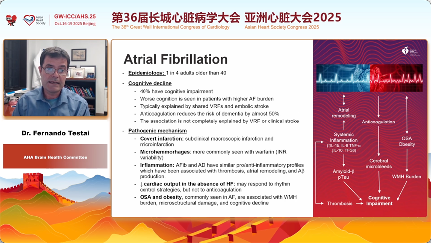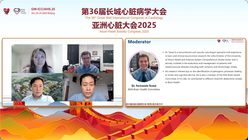 2025年10月14日,在第36届长城心脏病学大会暨亚洲心脏大会2025期间,ASA @ GW-ICC联合论坛线上举行。论坛聚焦“关于连接心脏与大脑健康的新视角”。论坛由首都医科大学附属北京安贞医院的霍晓川教授与美国伊利诺伊大学芝加哥分校的Fernando Testai教授共同主持。四位海内外顶尖的心脑血管领域专家,从基础机制、临床挑战、创新生物标志物到多学科实战经验,为我们深入描绘了心脑健康之间密不可分的深刻联系。