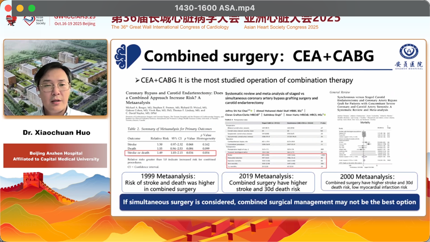 首都医科大学附属北京安贞医院的霍晓川教授,作为一名神经介入专家,分享了安贞医院多学科团队在处理复杂心脑共患病方面的丰富实战经验。他聚焦于一类极具挑战性的患者:同时合并严重冠心病和颈动脉/颅内动脉狭窄,需要“心脑同治”。