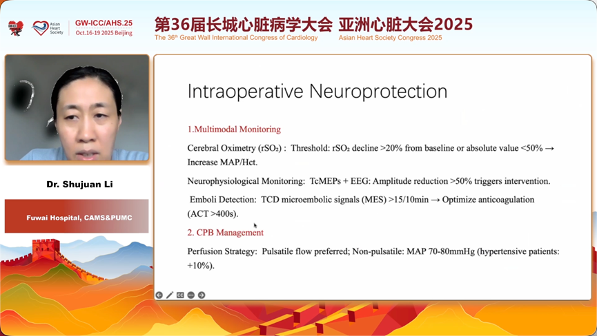 来自中国医学科学院阜外医院的李淑娟教授,立足于全球最大的心脏中心之一,分享了心脏外科围术期神经系统并发症的严峻挑战与应对策略。她指出,尽管心脏手术死亡率已降至极低水平,但术后卒中、谵妄、认知功能障碍等神经系统并发症的发生率仍不容忽视,严重影响患者预后。