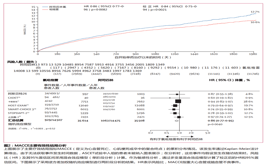 中位随访 2.3 年(IQR 1.1-4.0),最长随访 5.5 年时,氯吡格雷组 MACCE 发生率显著低于阿司匹林组(929 例事件,2.61/100 患者年 vs 1062 例事件,2.99/100 患者年),HR=0.86(95% CI 0.77-0.96,p=0.0082);多变量调整后 HR=0.84(95% CI 0.75-0.94,p=0.0021),两阶段分析结果一致(HR=0.86,95% CI 0.77-0.95,p=0.0040),且试验间无显著异质性(I²=0%,τ²=0.003,p=0.52)。