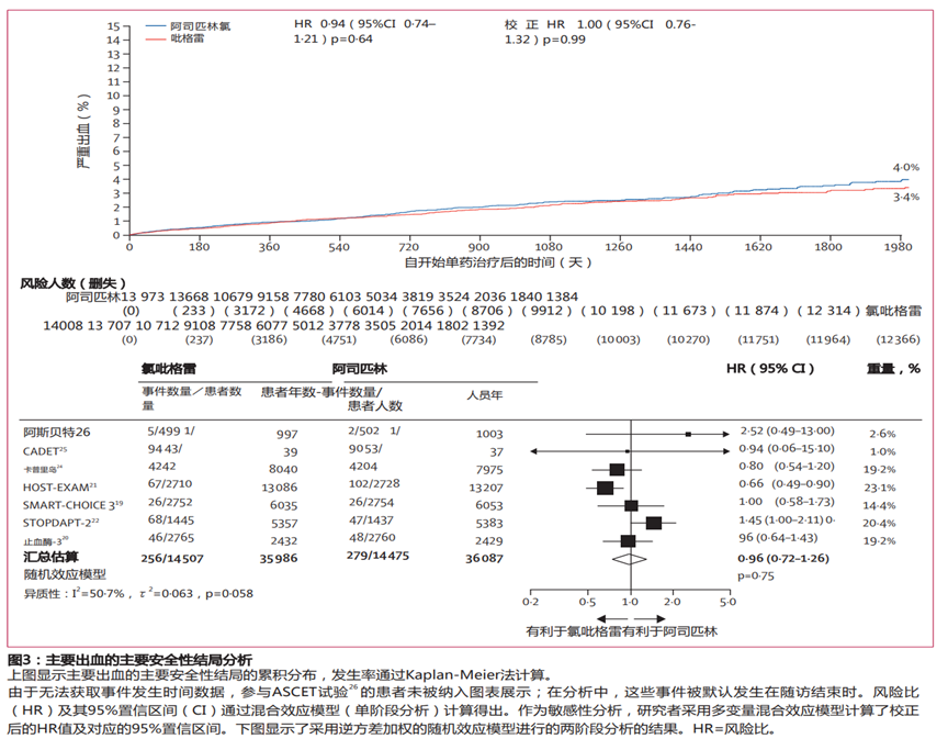 (2)其他终点:全因死亡、心血管死亡、支架内血栓、任意出血、严重胃肠道出血及任意胃肠道出血在两组间无显著差异;但氯吡格雷组心肌梗死(HR=0.76,95% CI 0.66-0.89,p=0.0004)和卒中(HR=0.79,95% CI 0.66-0.96,p=0.018)发生率显著低于阿司匹林组。