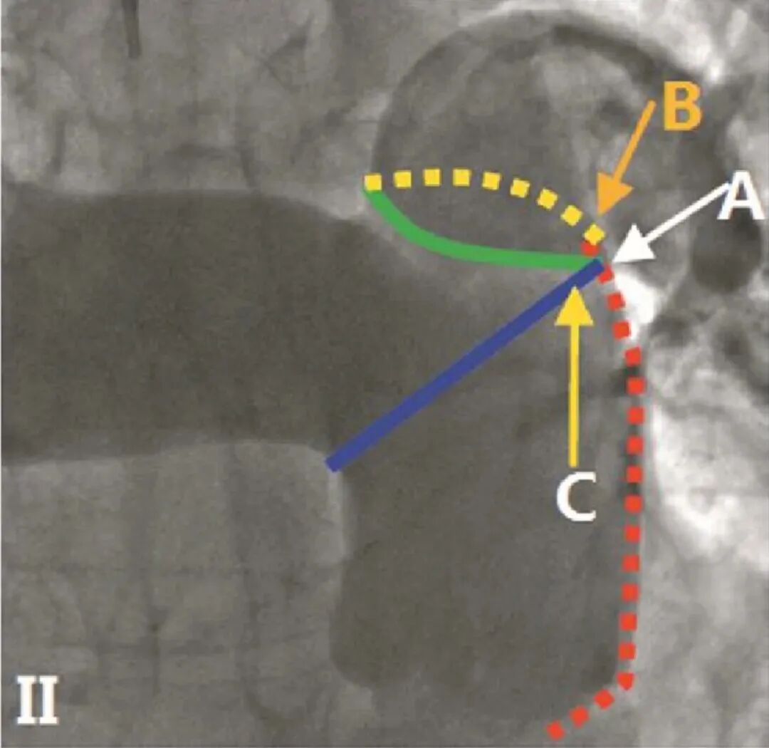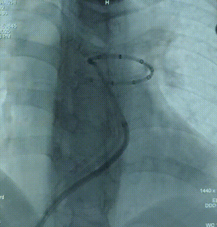 通过对比术前超声、CT报告及术中造影,选定消融靶点和50mm射频消融导管(按测量直径1.1-1.2倍选择导管)。交换导丝导管,建立消融通道。