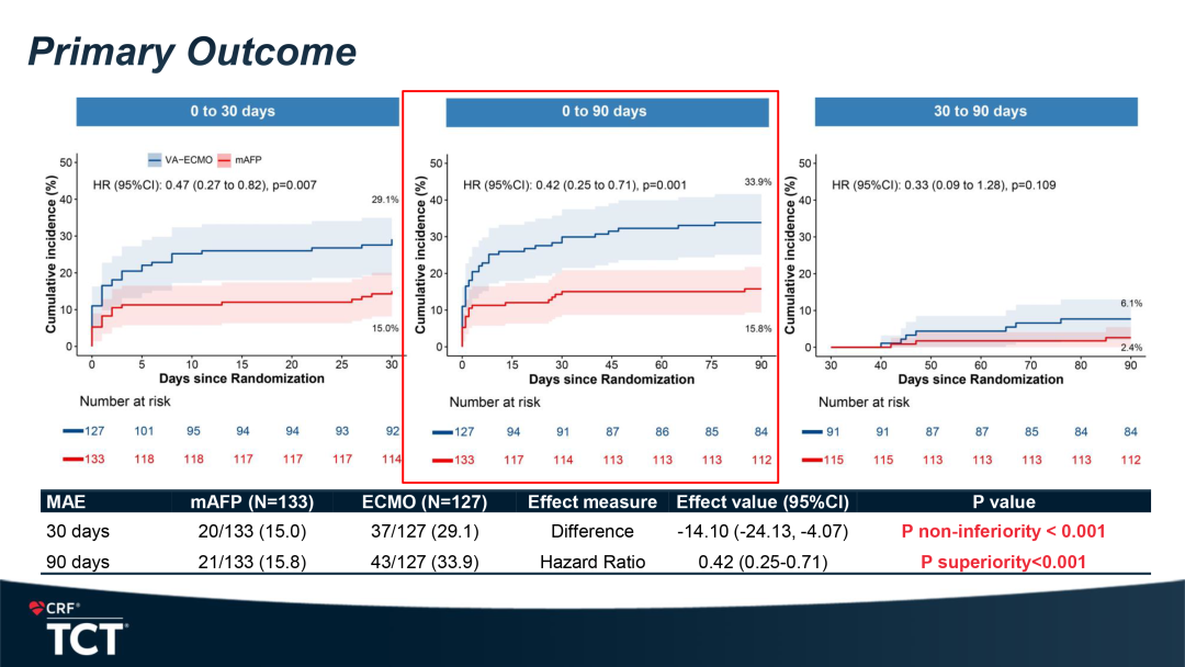30天时,mAFP组MAE发生率为15.04%(20/133),VA-ECMO组29.13%(37/127),率差(试验组-对照组)为-14.10%,95% CI为(-24.13%, -4.07%),差异具有统计学意义(P非劣 <0.001)。90天时,和VA-ECM0组相比,mAFP组能够降低MAE事件的发生(15.8% vs. 33.9%; HR: 0.42; 95%CI: 0.25-0.71; P优效<0.001)。