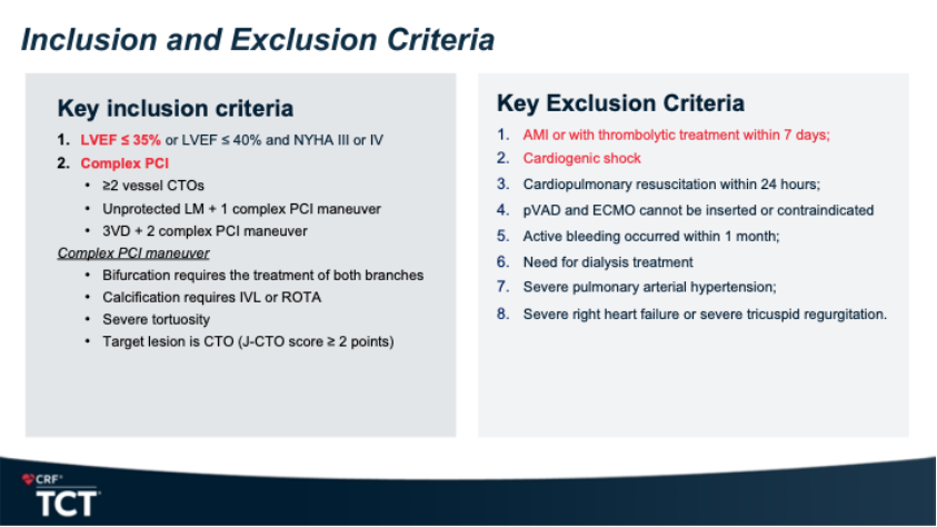 本试验主要纳入人群为:左室射血分数(LVEF)≤35%或LVEF≤40%且NYHA心功能分级为III级和IV级的复杂PCI患者。主要排除标准为:(1)7天内的急性心肌梗死或接受溶栓治疗;(2)心原性休克;(3)24小时内进行过心肺复苏;(4)pVAD和ECMO无法置入或存在应用禁忌症;(5)1个月内出现过活动性内脏出血;(6)需行透析治疗;(7)严重肺动脉高压;和(8)严重右心功能衰竭或严重三尖瓣反流。