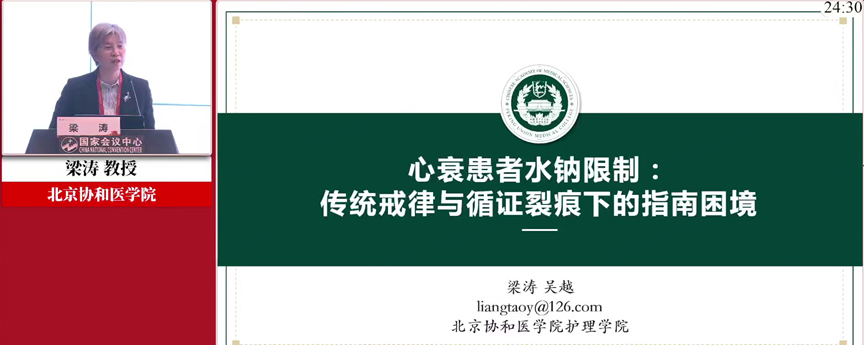 北京协和医学院的梁涛教授以 “传统纪律与循证练习下指南的困境” 为主题,深入剖析了心衰患者限水限钠管理的争议性问题。她指出,限水限钠作为心衰护理的传统措施,虽在国内指南中仍有保留,但国际指南已悄然发生变化 —— 美国心脏病协会(AHA)自 2013 年起逐步删除相关表述,欧洲心脏病学会(ESC)和加拿大指南也先后跟进。
