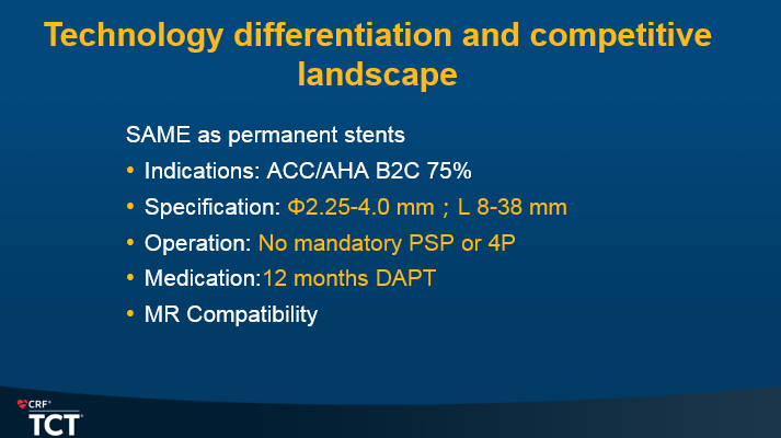 支架永久置入体内,可能引发支架内血栓形成、血管慢性炎症、血管愈合延迟、支架疲劳断裂、以及患者需要终生服用抗血小板药等问题; “介入无植入”是医疗器具发展的目标,业内普遍期待生物可吸收支架(BRS)能够实现冠脉领域治疗突破;生物可吸收支架(BRS)的出现带来了曙光,雅培的Absorb BVS曾经被广泛关注,寄予厚望 ;但是2016年发布的ABSORB Ⅱ研究的3年结果则显示,与DES比较,Absorb BVS有更多的晚期管腔丢失和POCE,尤其是靶病变相关心肌梗死和晚期支架血栓发生率显著增加,导致了2017年Absorb BVS的退市。 TCT会议发布的IRONMAN-Ⅱ研究2年结果显示在更长随访时间范围内,IBS同样具有良好的安全性和有效性。该研究最终随访5年。