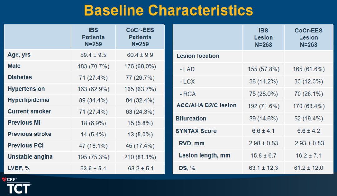 研究在2022年3月至2022年12月期间,共入组518例受试者,两组基线情况相似,ACC/AHA 定义的B2/C病变比例在IBS支架组中稍高(71.6% vs 63.4%);器械成功率、病变成功率均达到100%;临床成功率IBS支架组99.6%,略高于Xience支架组98.8%;术中结果显示IBS支架具有良好的推送性、通过病变性、覆盖病变能力、支撑力及回撤性能。