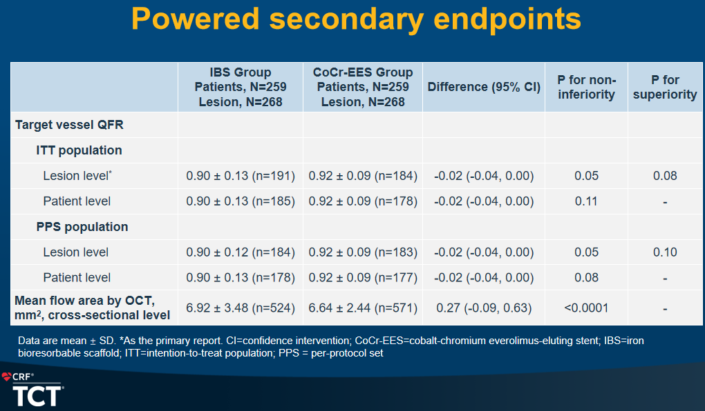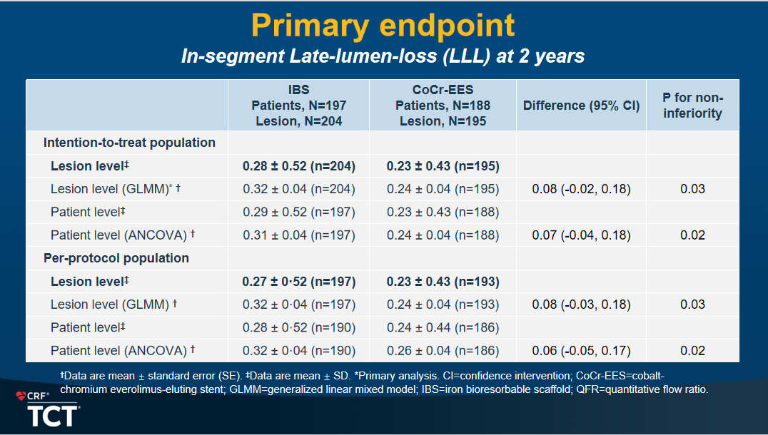 本研究以术后2年QCA评估的病变节段内晚期管腔丢失(In-Seg. LLL)为主要研究终点;试验组和对照组结果分别为0.28±0.52mm和 0.23±0.43mm,组间疗效差值的均数的95%置信区间上限均小于预先设定的非劣效界值(0.195mm),非劣效假设成立(p for non-inferiority =0.03)。并且在病变水平、病人水平的FAS集、PPS集、ATS集中同样达成非劣,表示结果稳健。另外本研究设置了主要次要终点术后2年定量血流分数QFR以及OCT测量截面水平平均血流面积(仅OCT亚组),均同样达到了非劣结果。