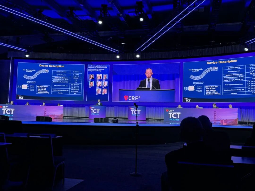 2025年TCT会议在美国旧金山开幕,全球心血管顶尖专家群英荟萃;美国当地时间10月27日下午Late-Breaking Clinical Science专场,中国医学科学院阜外医院宋雷教授代表高润霖院士和全体研究者公布了IRONMAN-II随机对照研究2年临床结果。结果显示IBS支架2年晚期管腔丢失非劣效于与Co-Cr EES永久金属支架,而且作为一款可吸收支架同时具有极高的即刻成功率、极低的支架内血栓和心源性死亡风险,改善了第一代PLLA生物可降解支架发生的支架内血栓形成等问题。同时宋雷教授于10月26日09时16分受邀在TCT大会创新专场(Innovation Session)对由中国企业自主研发,具有独立知识产权的新一代超薄(厚度55μm-65μm)铁基生物可吸收冠脉支架向全球主流专家进行了详细的介绍;我们特邀宋雷教授对这两个专题进行解读。