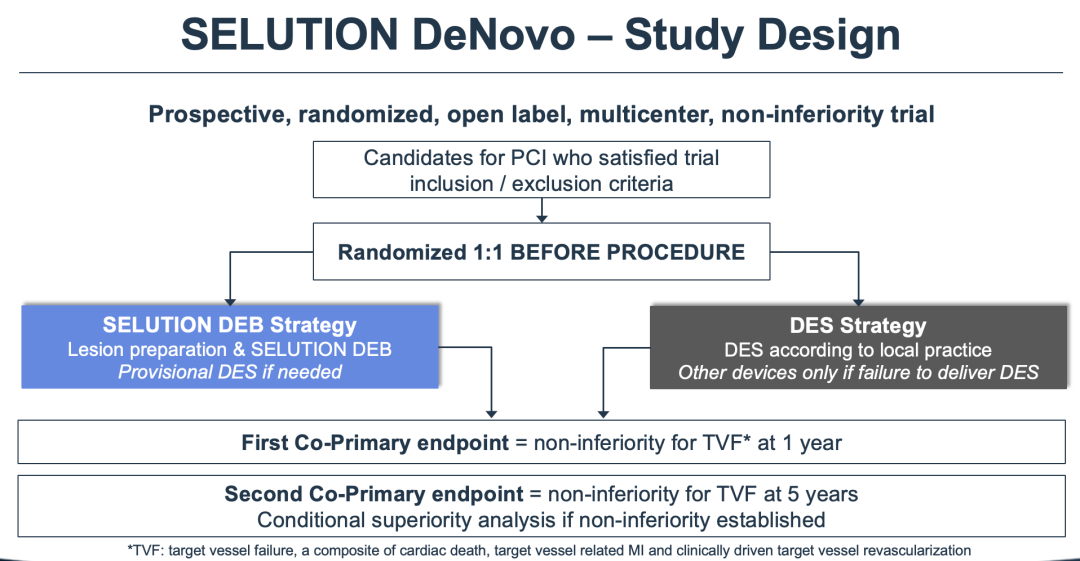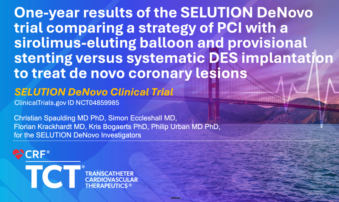 SELUTION DeNovo研究为一项介入前随机的策略性比较试验,纳入3,323例广泛适应症患者,对比“DCB+必要时支架”与常规DES植入。