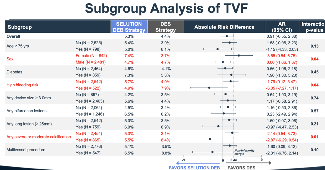 探索性亚组分析中出现了一些有意思的信号。例如,高出血风险(HBR)患者和病变中重度钙化患者在 DCB 策略下的 TVF 发生率反而低于 DES 组,而女性患者在 DCB 组的事件率则略高于 DES 组。上述亚组交互作用虽具有统计显著性,但需谨慎解读——可能与多重比较下的偶然偏差有关。目前尚无充分依据认定某类人群不适用该策略或更适用该策略。这些差异将随着更长随访和更多研究而逐步明朗。