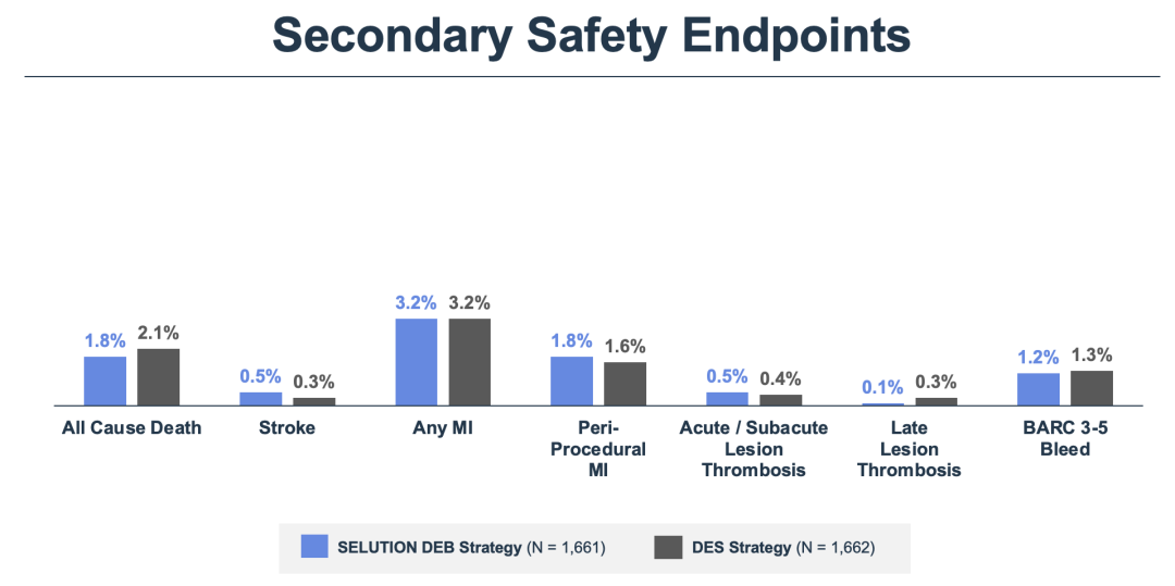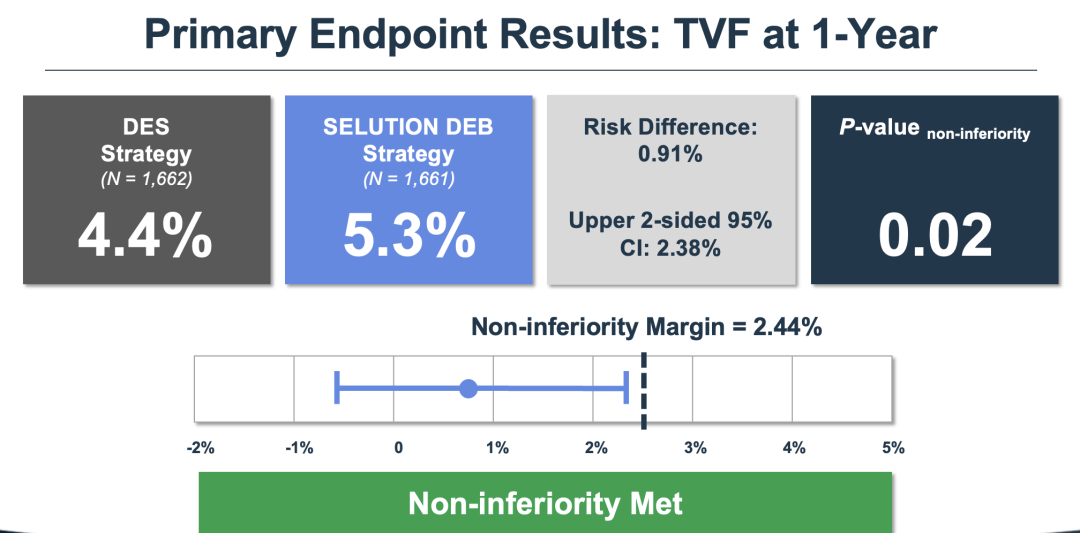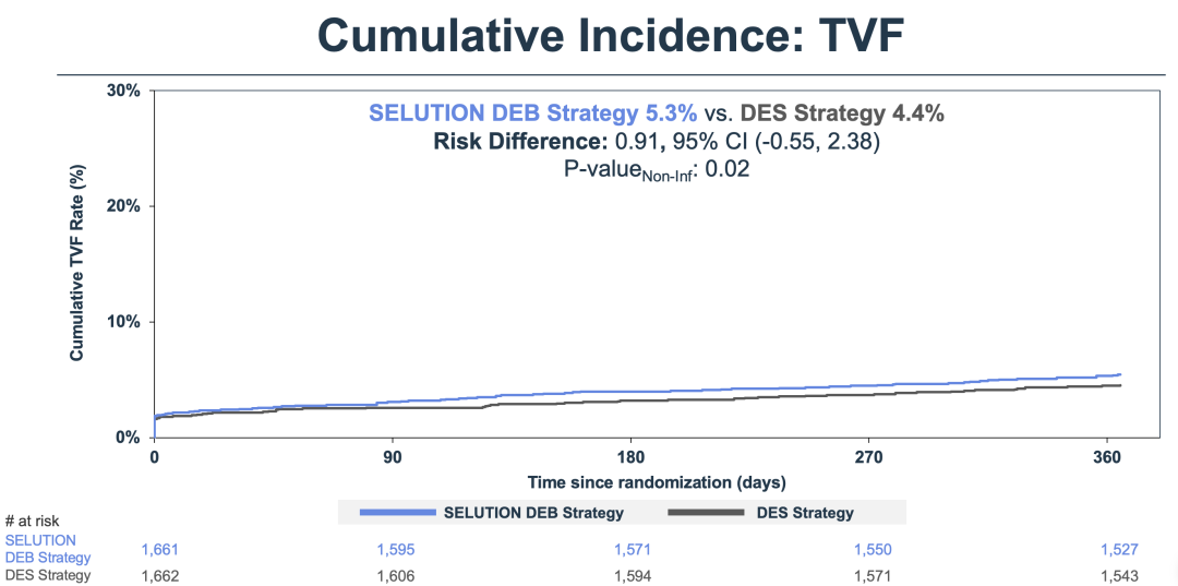 试验主要终点TVF一年发生率:DCB策略组5.3%,DES组4.4%,达到预设非劣界值(Δ=2.44%)。两组心源性死亡、靶血管心梗等安全事件无显著差异。