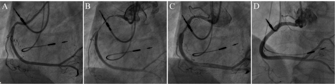 JR4造影导管深插至右冠(A),退至开口造影提示近段严重狭窄(B),冠脉内注射硝酸甘油200μg×3次只有部分缓解(C),继续推注200μg×2次后基本缓解(D)。说明部分患者强刺激后痉挛比较持久。该病人并无血管痉挛的临床表现,术后不需要抗痉挛治疗。