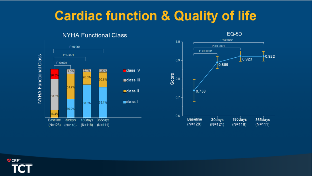 同时,患者的NYHA心功能分级和生活质量(EQ-5D)也有持续的明显改善(图7)。