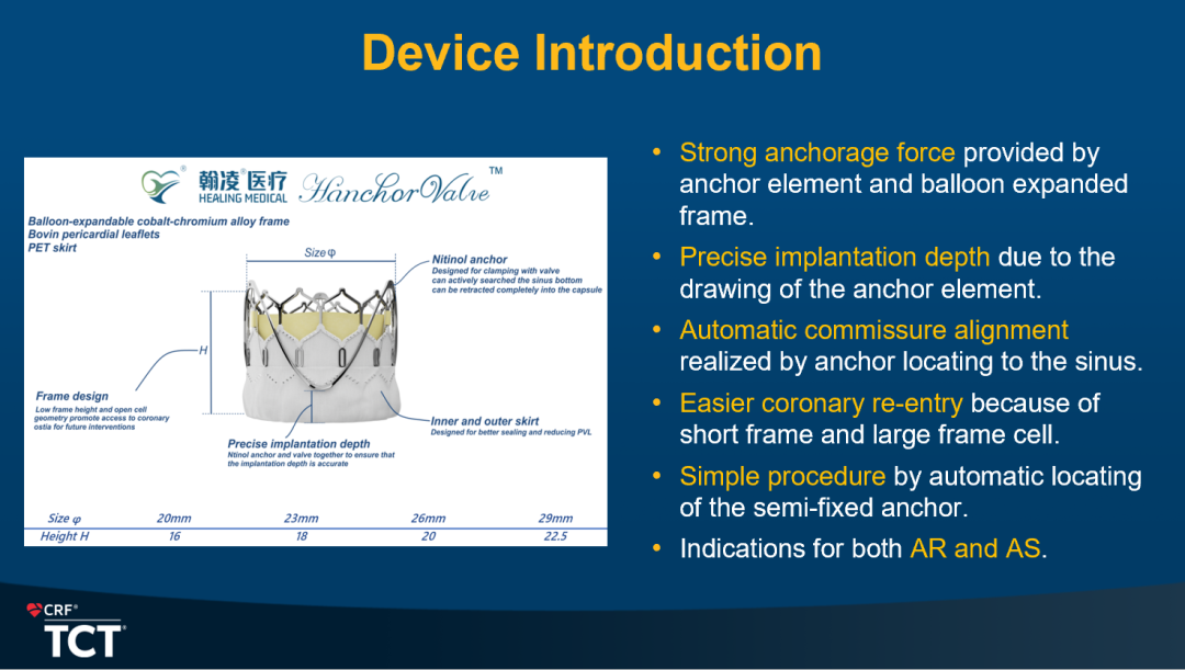 潘文志教授首先介绍了Hanchor Valve系统锚定件与瓣架支架之间强大的夹持力是区别于其他AR专用瓣膜的特点,使其不需要依靠增加oversize ratio来达到锚定目的。该系统半固定的锚定件连接设计让其能自动定位插入主动脉窦内,同时实现窦对齐,结合其短瓣架设计最大化冠脉再介入通路,并通过调节连接线长度来控制植入深度,此外,其球扩瓣架支撑性良好,使其具备治疗AS和AR双重性能(图3)。