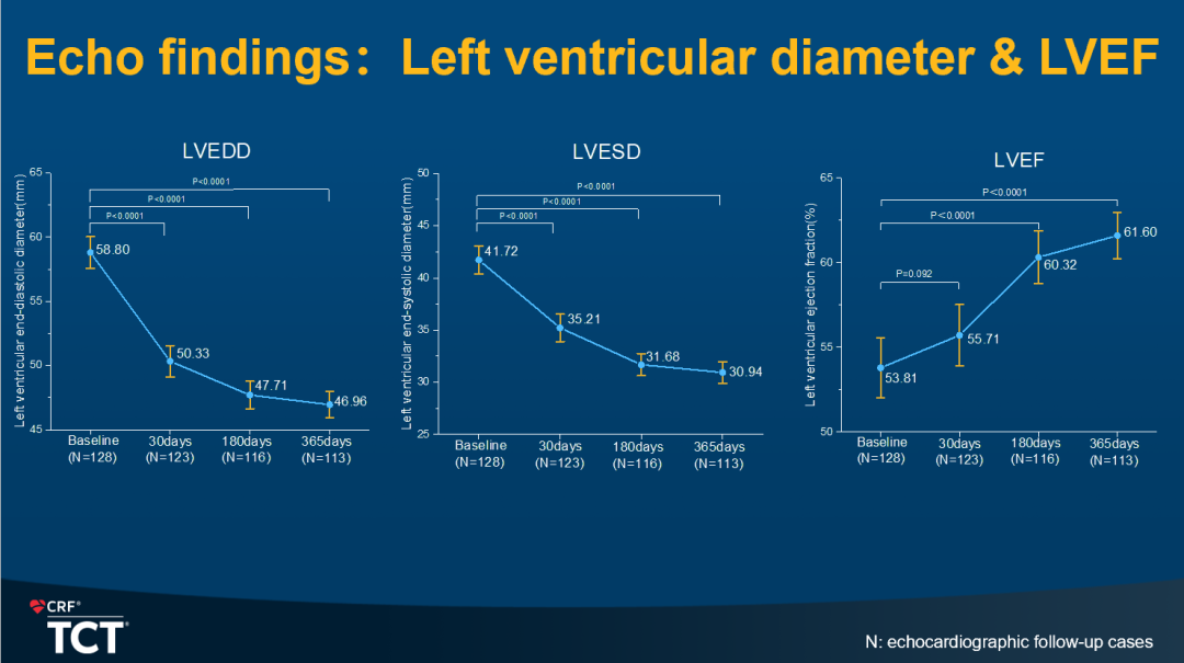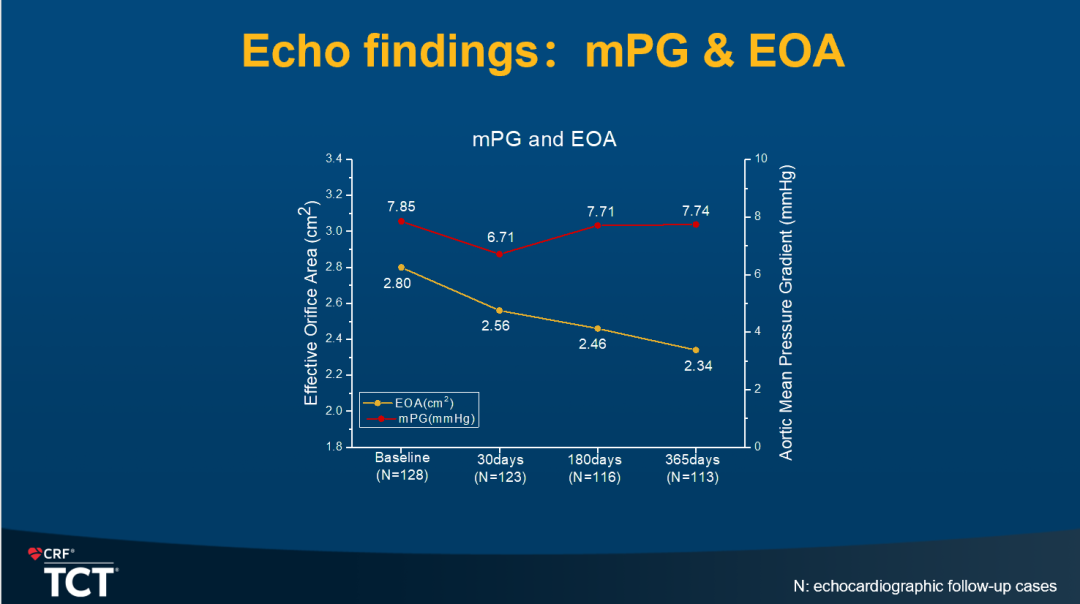 随后,潘文志教授报告HAVE AR trial是一项前瞻性多中心单臂目标值设定的注册研究,主要终点设定为1年的全因死亡率,安全性终点为复合主要不良事件发生率,同时记录分析人工瓣膜功能障碍(BVD)、心超表现、NYHA心功能及生活质量情况。试验中手术成功率达到96.09%,1年的复合不良事件发生率为21.43%,较同类器械低,尤其是起搏器植入率低(12.71%),并且在30天到1年的随访期内,没有新的起搏器植入患者增加,潘文志教授指出这很可能是因为人工瓣膜oversize ratio小(中位5.1%)、植入深度较浅(中位5mm)的获益。随访1年时,心超结果显示1名患者发生中度瓣中反流,1名患者发生中度瓣周漏,总BVD发生率为1.77%,超过98%的患者维持了不超过轻度的瓣周漏,有效瓣口面积(EOA)2.34cm²,平均跨瓣压差(mPG)7.74mmHg,提示其在人工瓣膜血流动力学表现维持良好,左室舒张末径(LVEDD)、左室收缩末径(LVESD)和左室射血分数(LVEF)也获得显著改善(图4-6)。