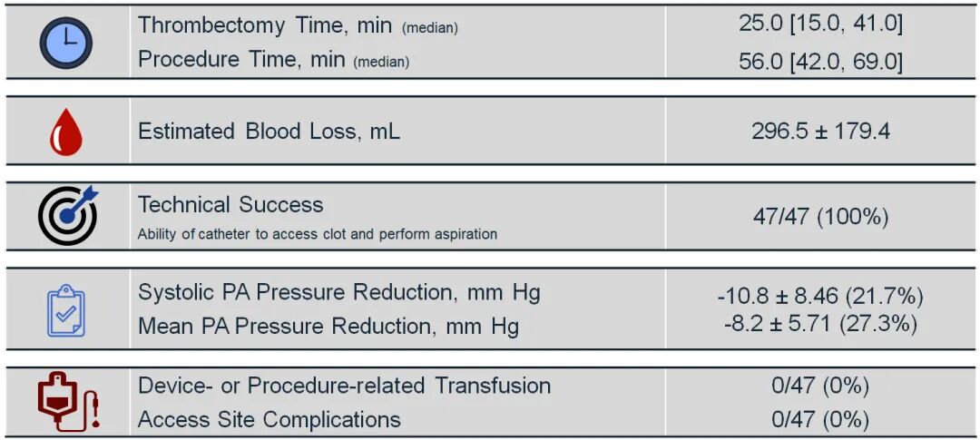 CAVT组47例患者均成功完成手术,技术成功率达100%。手术相关数据显示:血栓切除时间中位数为25.0分钟(IQR:15.0-41.0),总手术时间中位数为56.0分钟(IQR:42.0-69.0);估计术中失血量为296.5±179.4mL;术后肺动脉压力显著降低,收缩压平均降低10.8±8.46mmHg(相对降低21.7%),舒张压平均降低8.2±5.71mmHg(相对降低27.3%);全组无患者需要术中或术后输血,也未发生穿刺部位并发症。