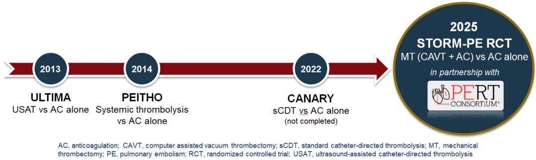 回顾PE血管内治疗的研究历程,过往的临床试验未能有效填补中高危患者治疗的证据缺口。2013年的ULTIMA研究对比了超声辅助导管定向溶栓(USAT)与单独抗凝,2014年的PEITHO研究聚焦全身溶栓与单独抗凝,但前者并非针对机械血栓切除术,后者则因安全性问题未能成为中高危患者的常规治疗选择。2022年启动的CANARY研究试图比较标准导管定向溶栓(sCDT)与单独抗凝,但尚未完成。在此背景下,STORM-PE研究的开展具有明确的临床价值:作为首个以MT(CAVT)联合抗凝为干预措施,与单独抗凝直接对比的RCT,其结果能够为中高危PE患者的治疗策略选择提供高级别证据,明确机械血栓切除术的疗效与安全性定位。