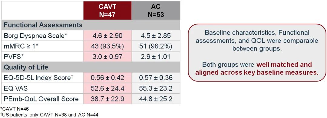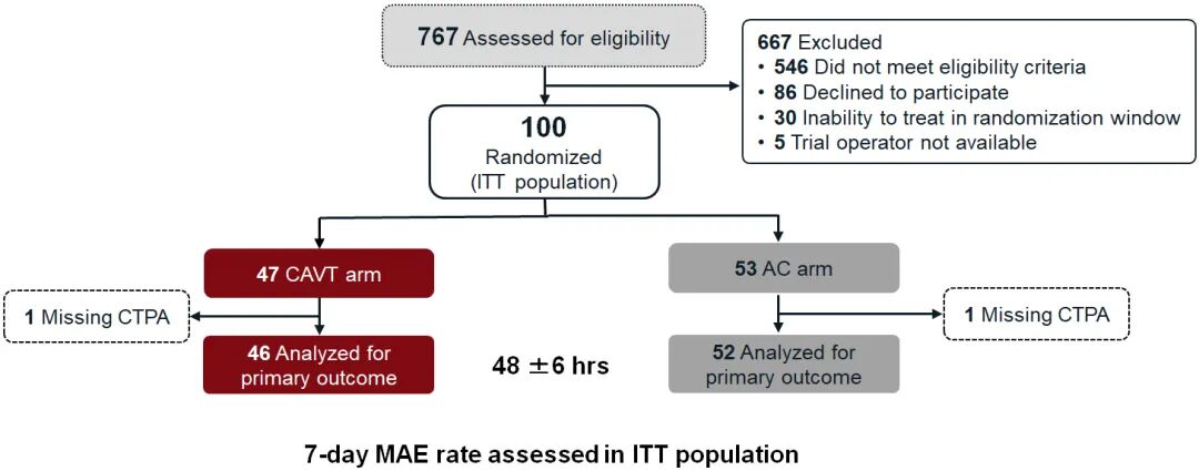 最终,研究共筛查767例患者,其中667例因不符合纳入标准(546例)、拒绝参与(86例)、随机化窗口期内无法治疗(30例)或试验术者不可用(5例)被排除,100例患者成功随机化,其中CAVT组47例,AC组53例,两组分别有46例和52例患者完成主要疗效终点评估(两组均有1例因缺失CTPA数据被排除)。