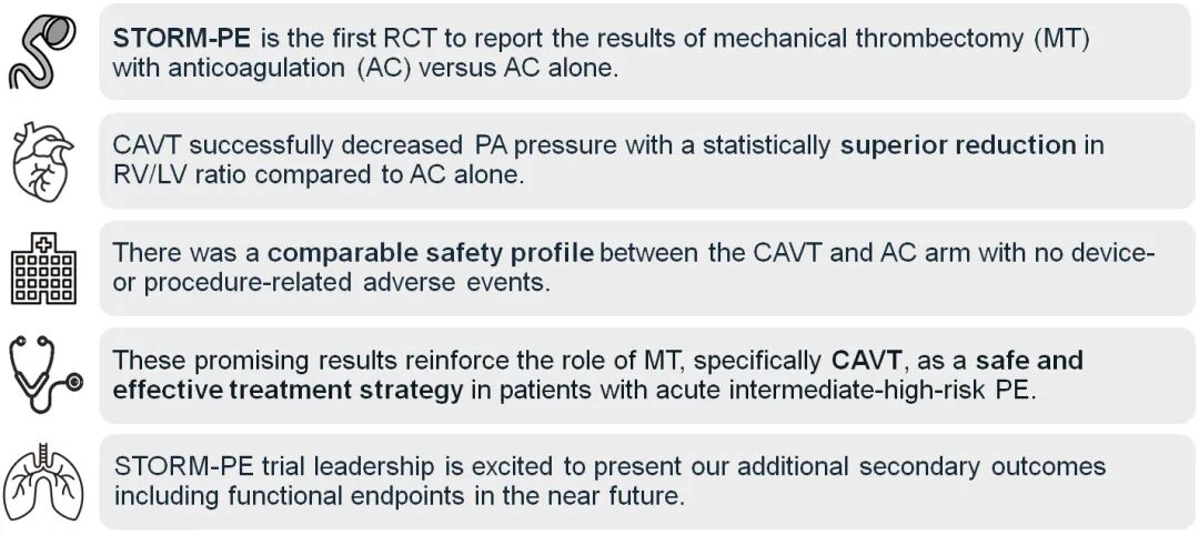 STORM-PE研究的结果显示,CAVT联合抗凝治疗在改善中高危PE患者右心室功能方面显著优于单独抗凝,且两组的安全性终点相当,未出现设备或手术相关的严重不良事件。