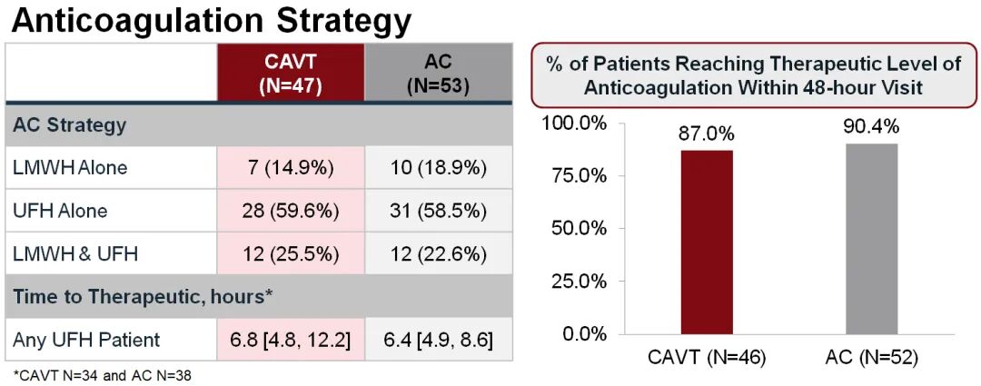 抗凝治疗达标情况显示,两组患者在48小时内达到治疗性抗凝水平的比例相近,CAVT组为87.0%,AC组为90.4%,进一步排除了抗凝治疗差异对主要结局的干扰。功能状态与生活质量的后续数据(30天、90天)尚未发布,研究团队表示将在近期公布相关结果。