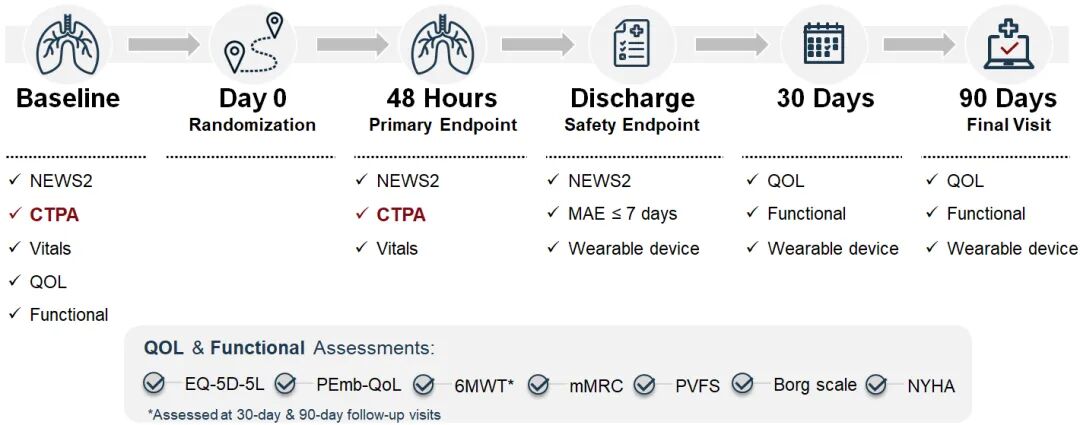 研究设定了统一的抢救治疗触发条件:当患者的NEWS2评分≥9时,判定为临床恶化,需启动抢救治疗,包括额外的机械血栓切除术、溶栓治疗、心肺复苏(CPR)、ECMO支持或外科血栓切除术等。启动抢救治疗的患者仍保留在原随机化组进行意向性治疗分析。