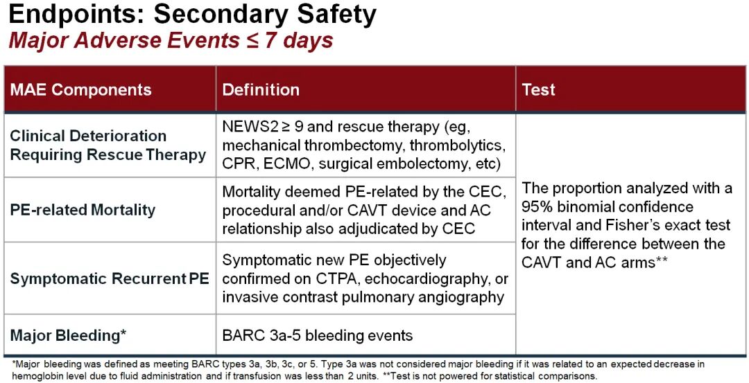 安全事件细节补充:CAVT组的2例PE相关死亡中,1例发生在入组当天,因术中咯血导致心脏骤停,病理检查未发现血管损伤;另1例发生在入组后第5天,因DVT治疗时使用非CAVT设备导致心脏骤停,经CEC判定均与CAVT设备或手术操作无关。CAVT组的1例大出血事件与临床恶化、死亡为同一患者。AC组3例临床恶化患者均成功接受抢救治疗,无死亡事件发生。