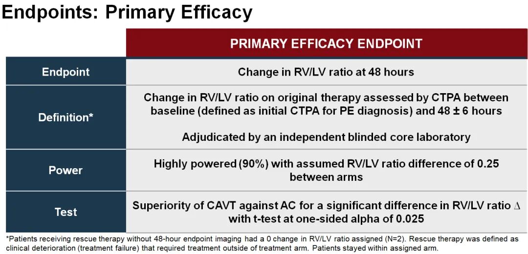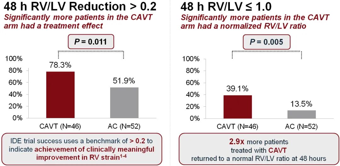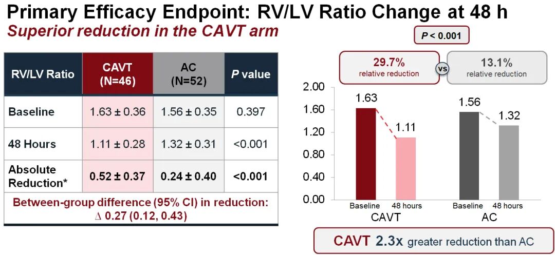 主要疗效终点分析显示,CAVT组在48小时时的RV/LV比值改善显著优于AC组。具体数据如下:
