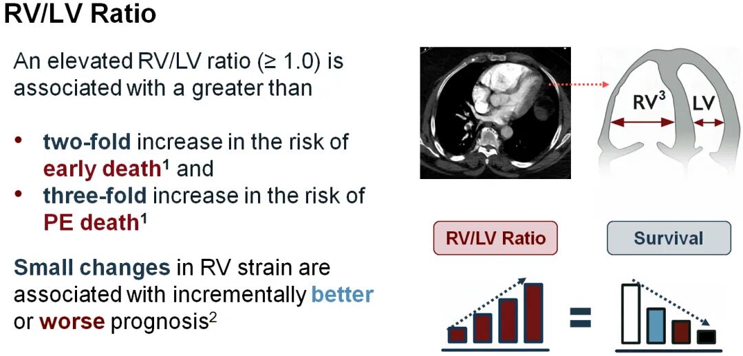 急性肺栓塞的严重程度分级中,中高危患者的核心特征是CTPA提示右心室/左心室(RV/LV)比值≥1.0,同时伴随心脏生物标志物升高。多项研究已证实,RV/LV比值升高与患者预后密切相关:该比值≥1.0时,患者早期死亡风险增加两倍以上,PE相关死亡风险更是升高至三倍。此外,右心室应变的微小变化也会导致预后的显著差异,及时改善右心室功能成为改善中高危PE患者结局的关键靶点。