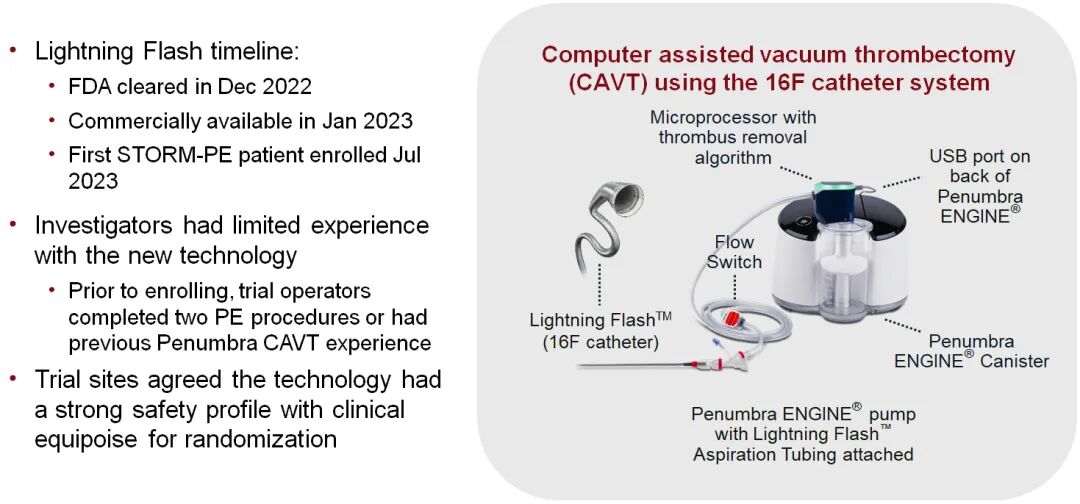 CAVT组采用Penumbra公司的Lightning Flash™ 16F导管系统联合Penumbra ENGINE®泵实施CAVT术。该设备于2022年12月获得FDA批准,2023年1月正式商业化上市,STORM-PE研究是其首次在RCT中接受疗效与安全性验证。