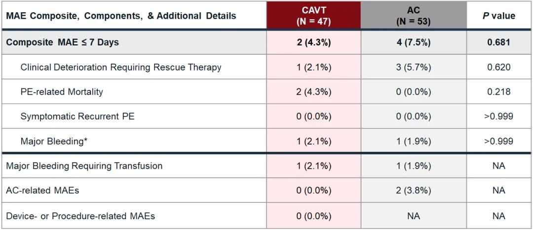 7天内主要不良事件(MAE)的复合发生率CAVT组为4.3%(2/47),AC组为7.5%(4/53),组间差异无统计学意义(P=0.681),具体构成如下: