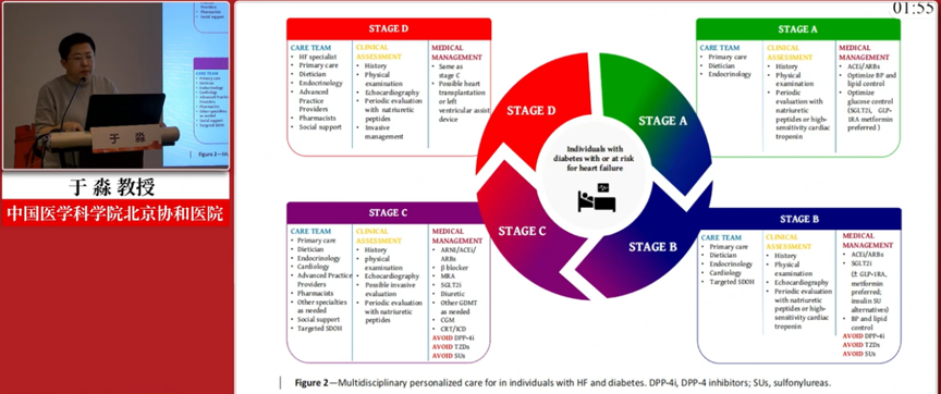 北京协和医院于淼教授在开场报告中系统阐述了糖尿病合并心衰的管理策略。于教授指出,心衰是糖尿病长期被忽视的重要并发症,流行病学数据显示,约15%的糖尿病患者以心衰作为首发心血管事件,且糖尿病合并心衰患者的5年死亡率高达40%。这一数据凸显了早期识别和干预的紧迫性。